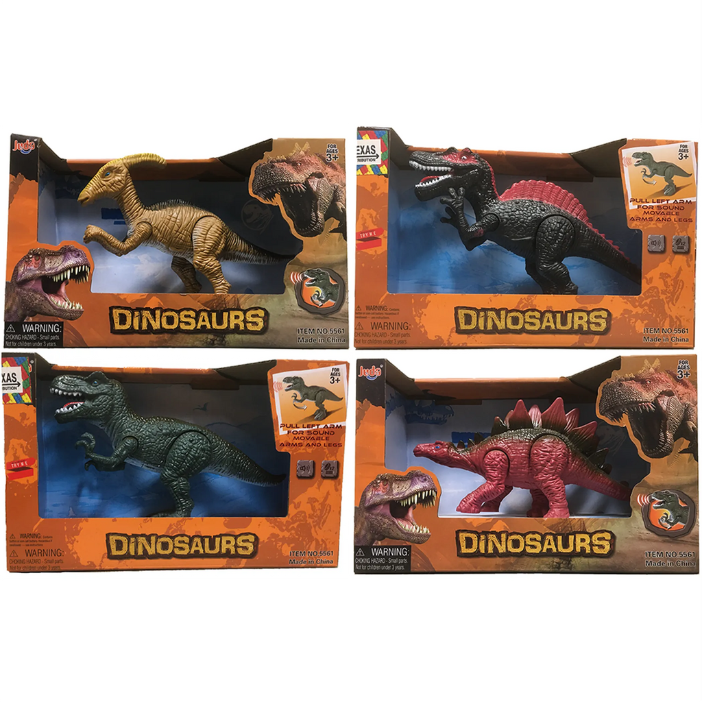 Kids can move the arms and legs and imagine these dinosaurs coming to life! Each dinosaur includes a Roar Sound Effect with a pull of the left arm/leg.