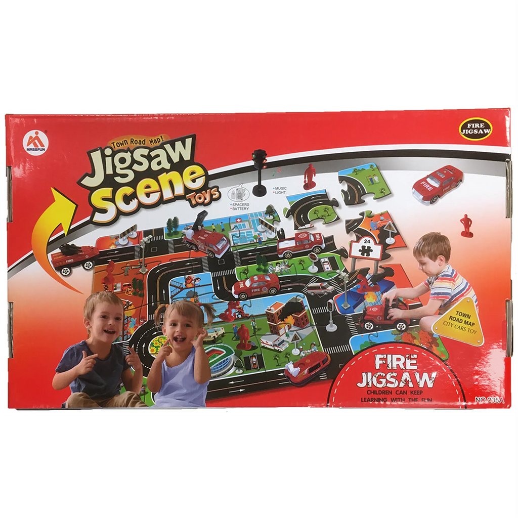 This floor puzzle comes with large jigsaw puzzle pieces, fire vehicles, and a variety of sign accessories! Assembled size 35" length by 23.2".