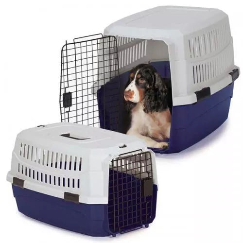 The Guardian Gear Contain-Me Crate makes transporting pets easy. This heavy-duty plastic crate features air vents, a metal door, and sturdy security latches.