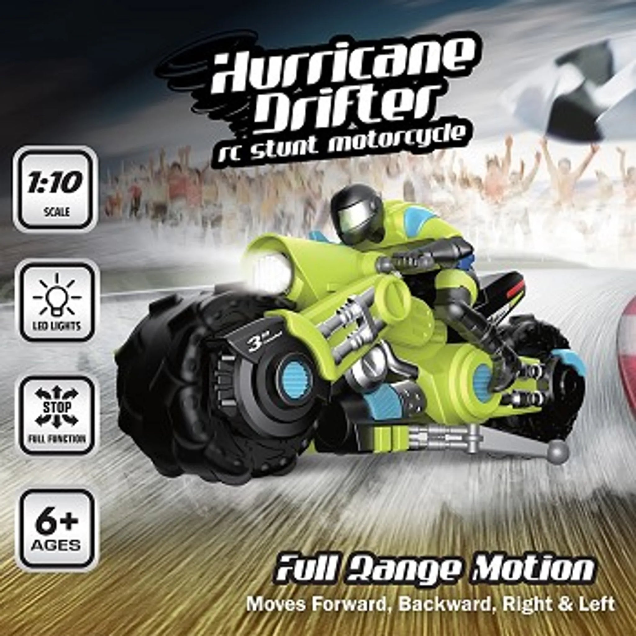 Our Hurricane Drifter Motorcycle makes anyone a high-stakes two-wheeled stunt man. Each Hurricane has illuminated LED head and tail lights and is capable of 360 degrees of full range motion. Each Hurricane is controlled by a 2.4 GHz remote control, allowing for multiple motorcycles to be played with simultaneously. The mega-sized wheels of the Hurricane have a number of integrated free-moving mini-wheels which create skids, drifts and other stunts a pro would be proud of. Measuring approximately 10 1/4 " x 3 1/4 " x 5 1/2 ", each Hurricane Drifter requires 6 AA batteries, (Not Included). With a Hurricane your child will be the envy of every 2-wheeled rider in the neighborhood! Made in China.
