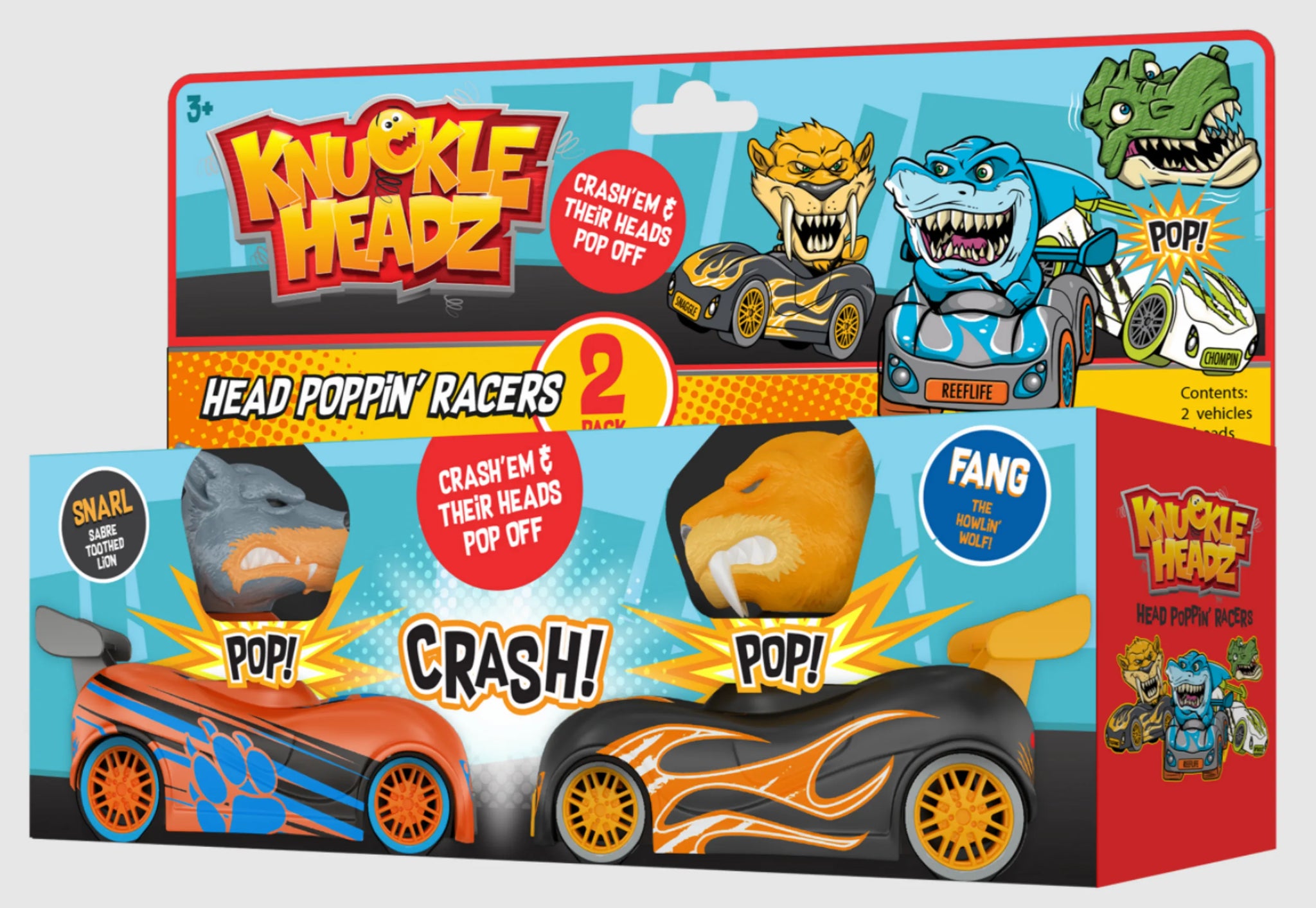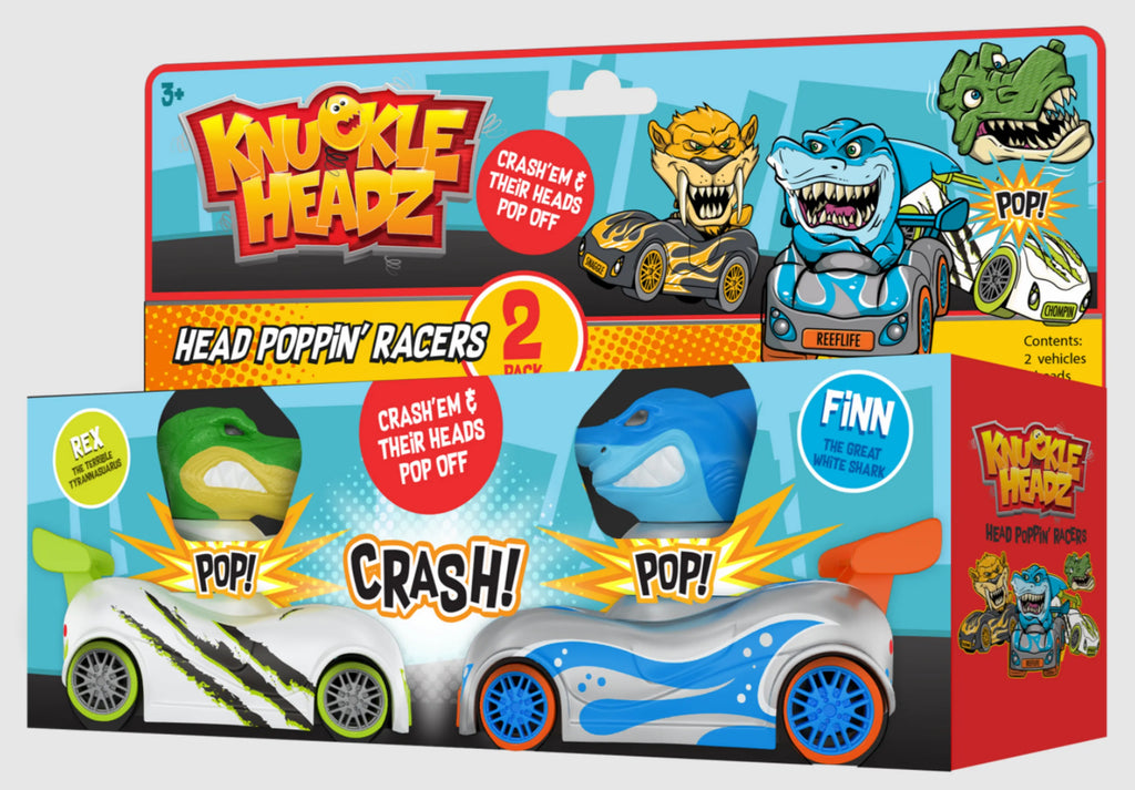 Fueled by a powerful pull-back motor, Knuckle-Headz simulates medieval jousting with a few modern twists. Six exciting new collectible characters face off in a battle to see which can keep its head. Define the battlefield, aim your vehicle at your opponents, pull back for maximum momentum, and let them zoom toward each other. Direct hits result in the loser's head popping off about 12 inches. Reset your spring-loaded characters head and face off again. 6 characters available in single and double packs.