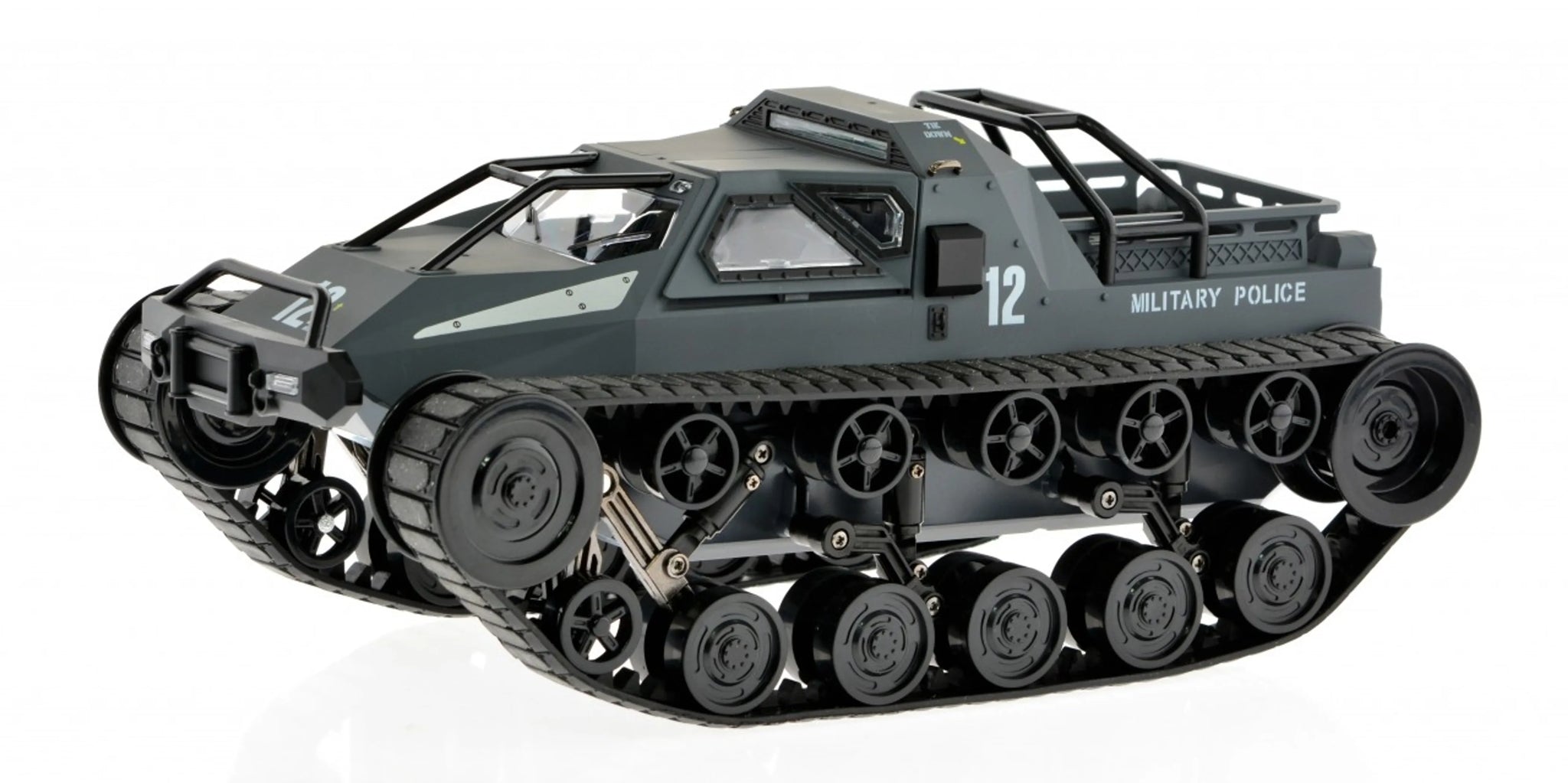 1:12 scale Wipsaw tank with proportional speed and steering overhead lights and hatch that can be opened to put a driver inside. 2.4 GHz remote system prevents interference and allows to run up to 50 tanks at the same time. Rechargeable batteries are environmentally friendly with run time of about 15 minutes per charge. The tank has overhead lights for night driving that can be turned on and off from the remote.. Top speed is about 10 KMH and the superb suspension allows to drive it over almost any terrain. The super high power motor and transmission will run the tank with it's nose up in the air until top speed is reached. This tank is top fun item, get in all 3 colors.