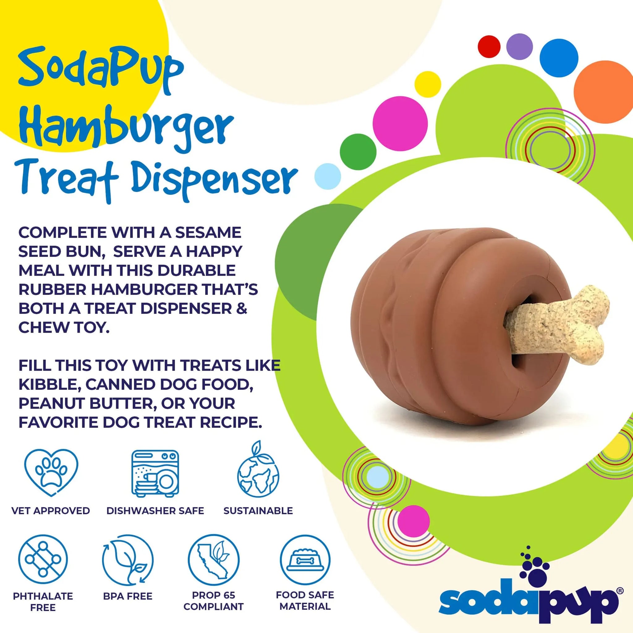 DURABLE CHEW TOY: The Hamburger Treat Dispenser is designed to withstand the abuse of most "power chewer" dogs.